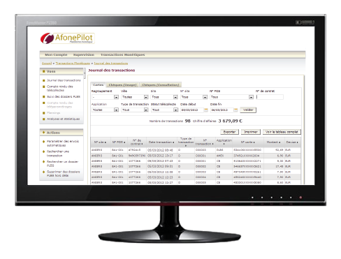 Afone Monetics met à votre disposition une interface web sécurisée vous permettant de suivre les encaissements de chaque point de vente, transaction par transaction, et quel que soit le canal de distribution utilisé (magasin, mobile, à distance, e-commerce).